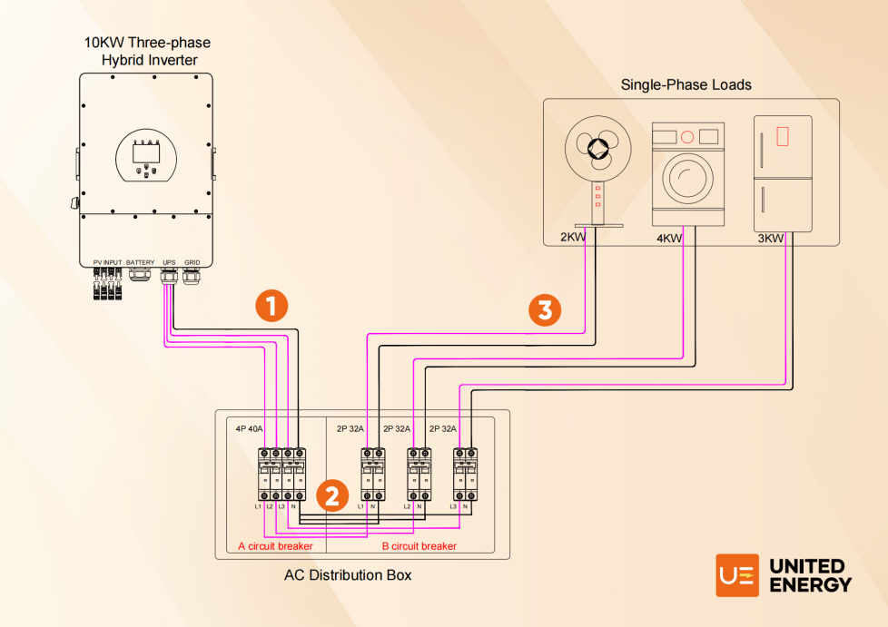 Connect the three-phase inverter to the circuit breaker (A) via the UPS port.